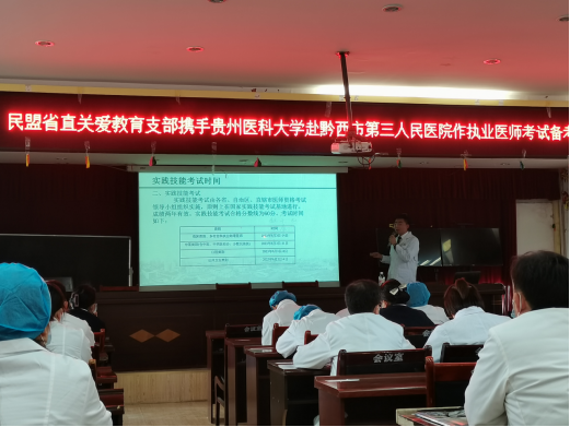 活动当天,临床医学院副教授、呼吸科专家廖景峰深入病房开展查房指导,22级博士王川进行“国家医师资格考试(NMEC)政策及大纲解析”讲座,21级研究生周颖分享了执业医师考试的备考经验。各科研究生为当地群众开展义诊,教工党支部教师与黔西市第三人民医院党支部进行座谈,就定向生培养、本科生见习、毕业生就业等方面问题展开交流。