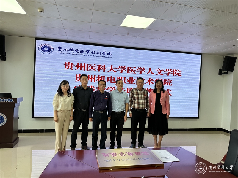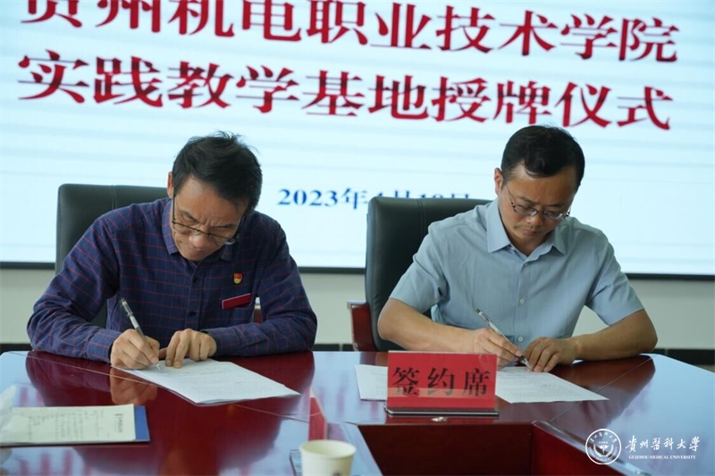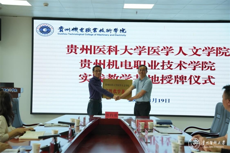 江宣成与刘猛代表双方签订《太阳成集团tyc33455cc官网医学人文学院贵州机电职业技术学院实践教学基地共建协议书》,同时举行“太阳成集团tyc33455cc官网医学人文学院实践教学基地”揭牌仪式。