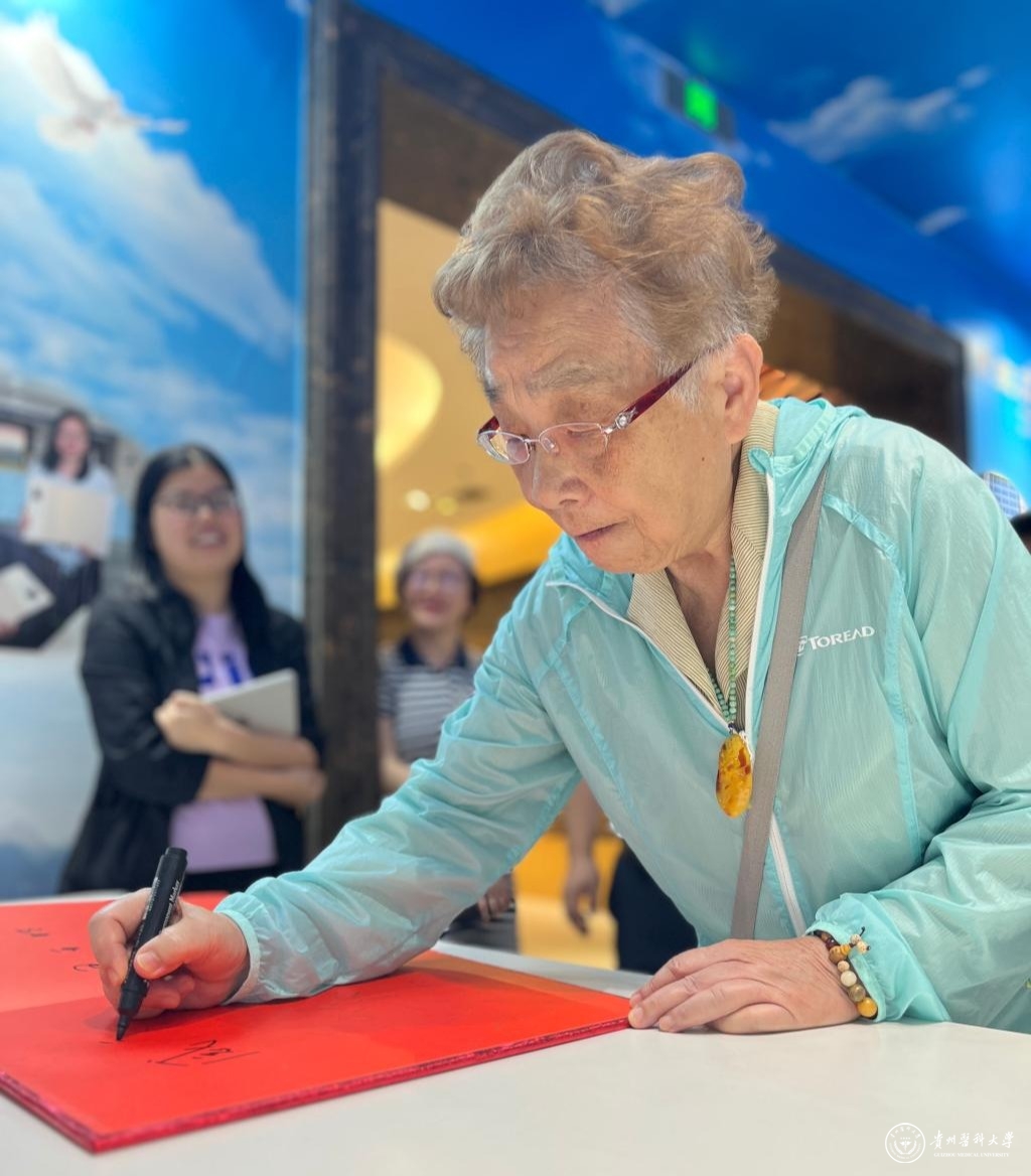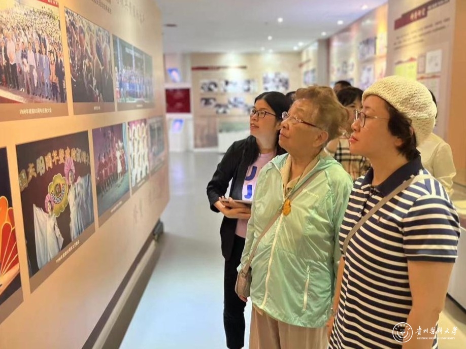 在校史馆,王开明教授及家人通过一张张珍贵的历史资料,一幅幅泛黄的老照片,一件件承载历史记忆的展品,见证了贵医八十五年的发展史、奋斗史,感受父辈饱含家国情怀,远离妻女在边陲西南办学兴医、严谨治学、医者仁心的精神,百感交集,尽显钦佩与自豪。在父亲及浙江相识校友的照片面前久久凝视。离开之际,王开明教授在签字簿上留下了“感受父辈创业艰苦”的赤诚心以及“希冀贵医更上层楼”的美好祝愿。