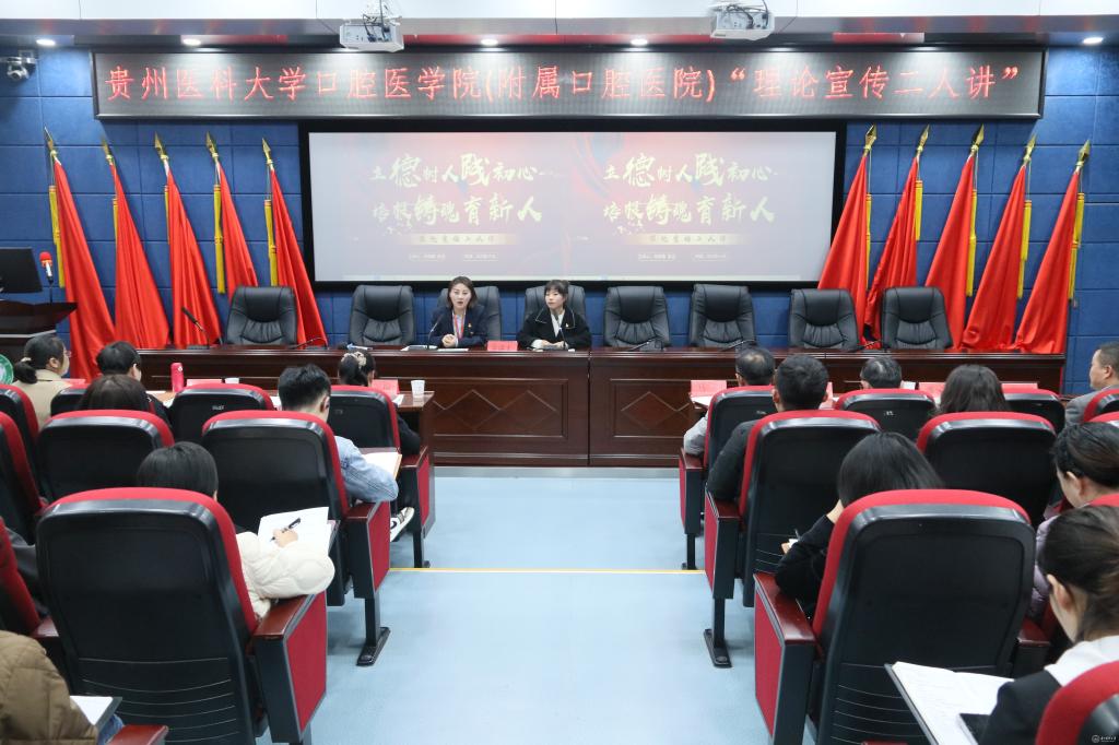 学院党委书记张军梅与口腔医学院教工第五党支部书记朱铭慧以“党的二十大精神一起学-实施科教兴国战略,强化现代化建设人才支撑”为题作宣讲,解读党的二十大报告“实施科教兴国战略,强化现代化建设人才支撑”专节,结合近年来学校高位推动教育科技人才工作的实践,围绕“立足新时代新征程党的历史使命,如何充分发挥人才作为第一资源的作用,如何服务社会抓落实,办人民满意的大学、办人民满意的医院,不断提高服务社会的能力”等内容展开对话和讨论。