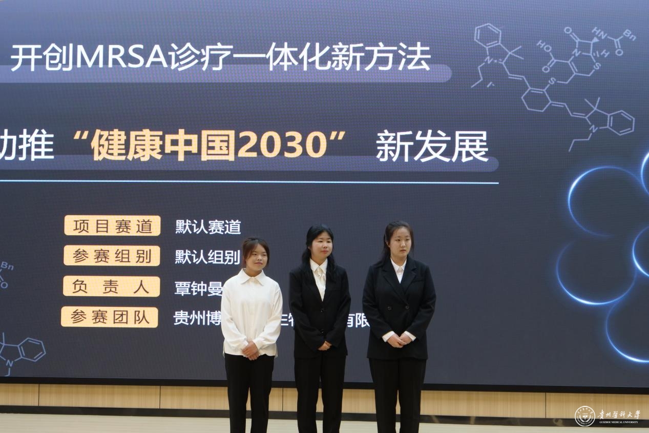 经过6小时的激烈角逐,“‘抛针引疗’MRSA诊疗一体化探针”“‘通脉饮’-1,8-桉叶油素仿生口服液治疗动脉粥样硬化”“黔山五穗-原生五色水稻点亮振兴之路”“控糖无忧——胰岛素口腔缓释膜剂的研发及推广”“康悦”五个团队获得常规赛校赛特等奖,并将推荐至省赛。