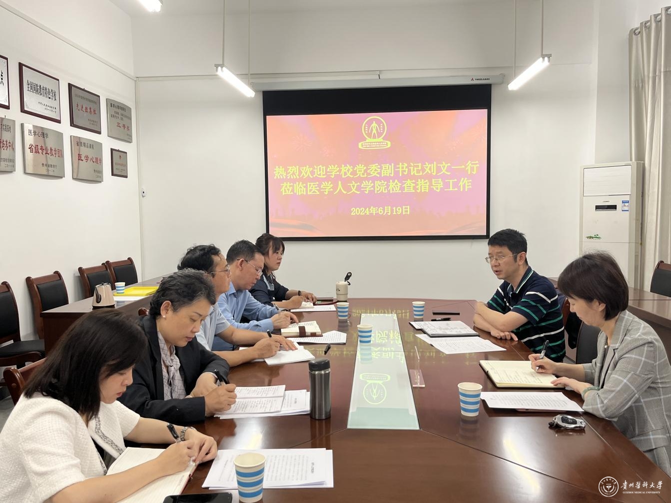 6月19日,校党委副书记刘文和党委宣传部(精神文明办)部长(主任)、党委统战部部长陈颖到医学人文学院检查指导工作,医学人文学院党政班子成员参加。