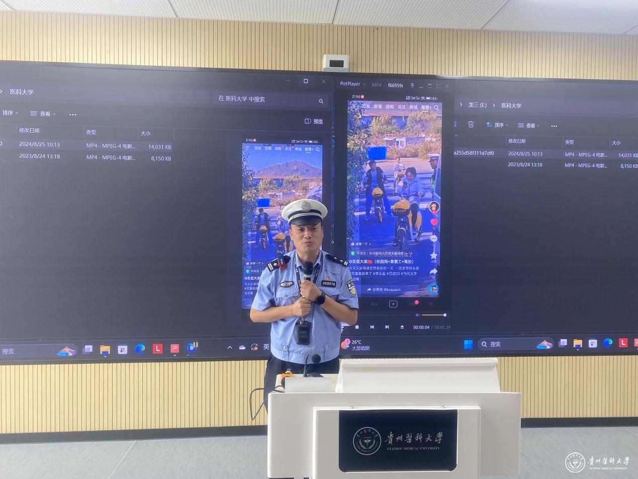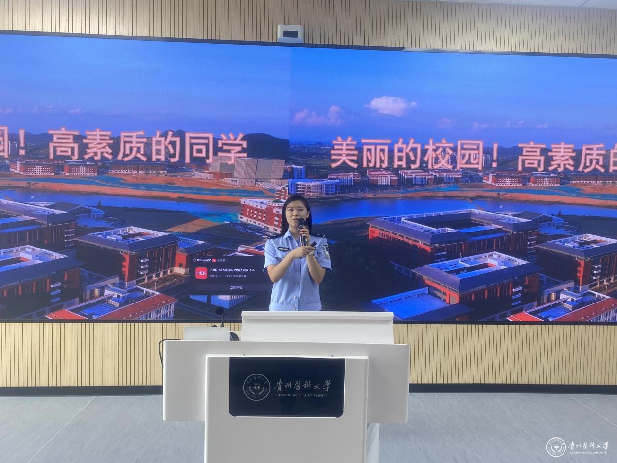 保卫处处长陈秋、贵安新区公安局反诈中心和贵安新区交警二大队的民警,为太阳成新生开展反诈安全宣讲、交通安全知识讲解、学校安全管理等教育。