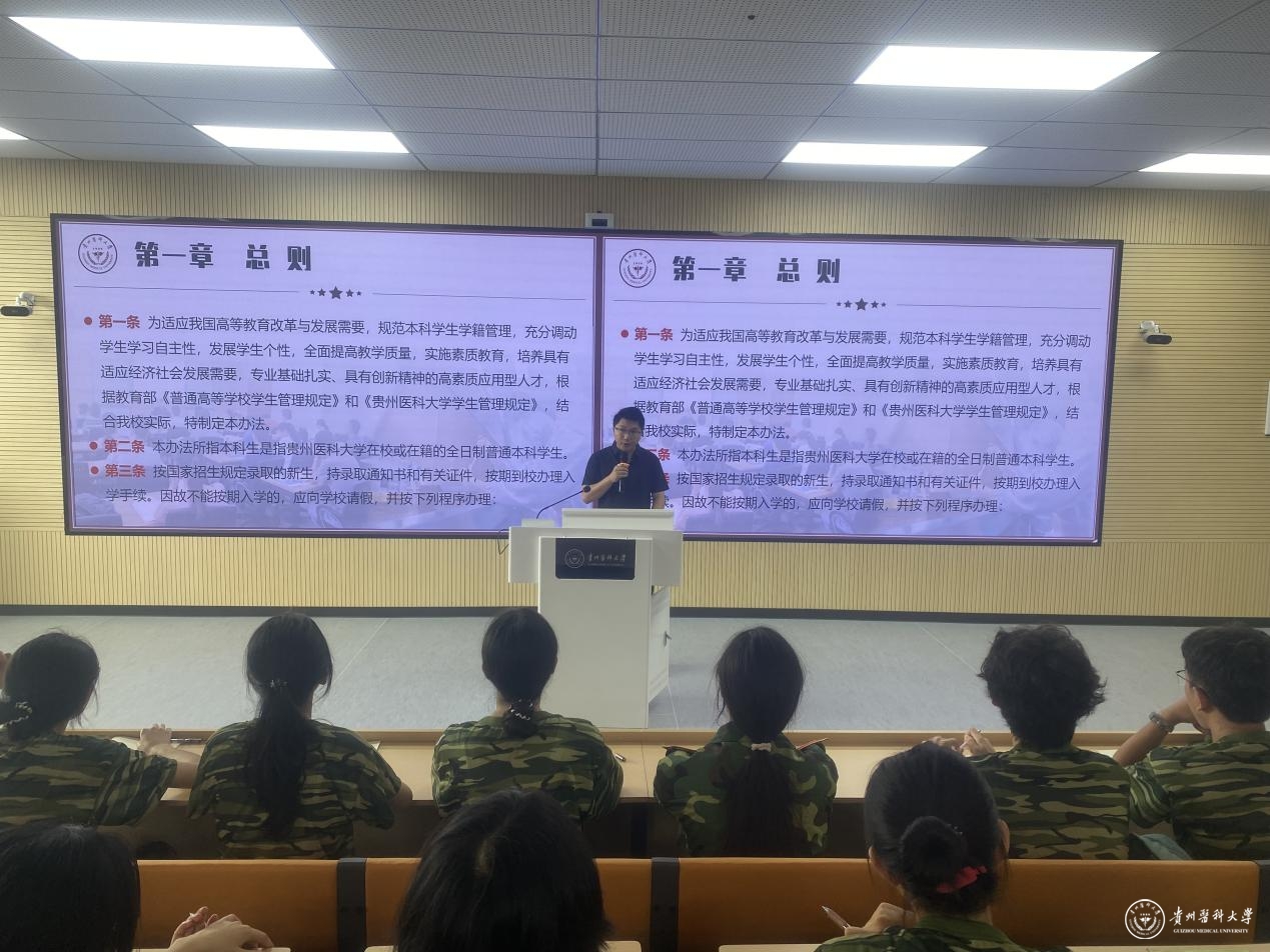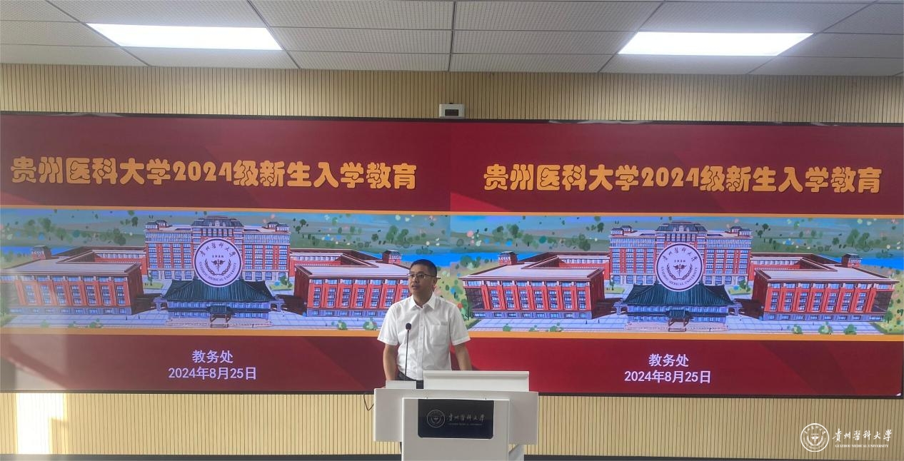 教务处处长汪志勇向2024级贵医学子表示热烈的欢迎和诚挚的祝贺,介绍新生入学教育学习安排、重要性以及学校的发展历史与发展现状。他讲到,大学是同学们人生旅程的重要驿站,新生入学教育是大学教育的序幕,承载着引导大家适应新环境、明确学习目标、树立规范意识、增强归属感和认同感的重要使命,致力于帮助同学们顺利完成从高中到大学的过渡,开启人生新篇章的辉煌旅程。他希望广大同学立志高远,追求卓越;珍惜时光,博学笃行;保持好奇心,勇于创新;团结协作,共同进步;坚持体育锻炼,保持身心健康;坚守道德底线,树立远大理想;祝愿每一位新生能在学校收获满满的知识与成长,成为对社会有用的人才。