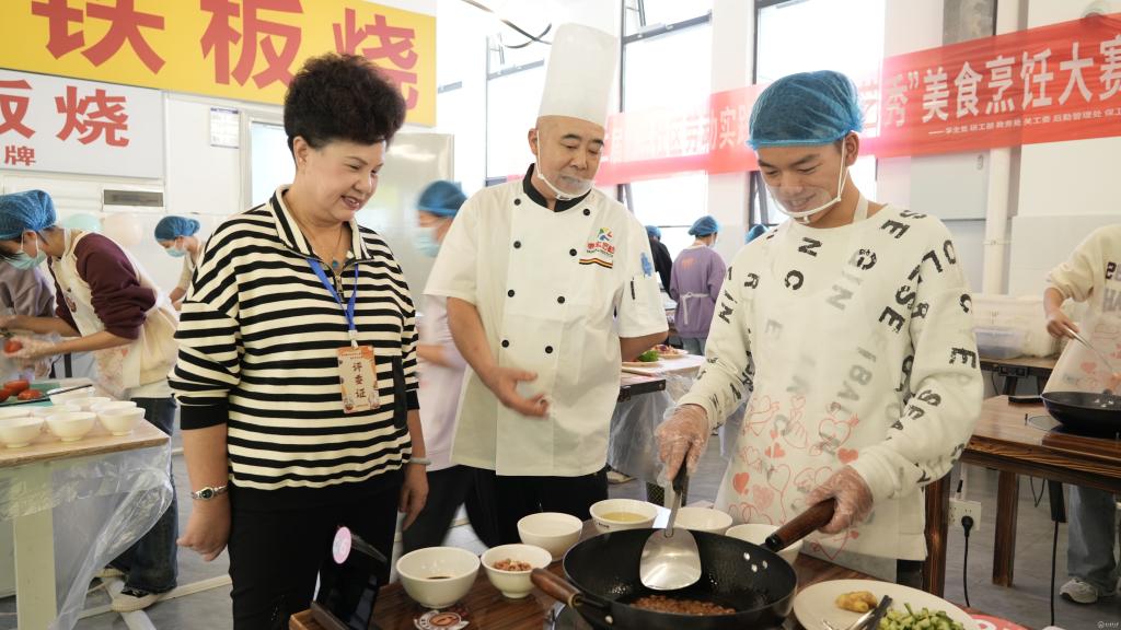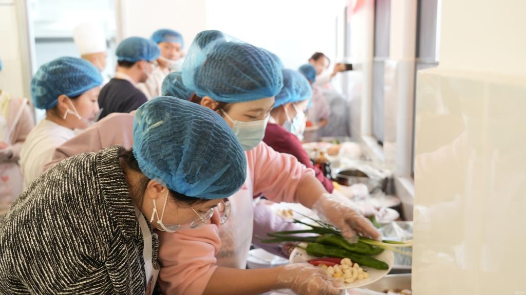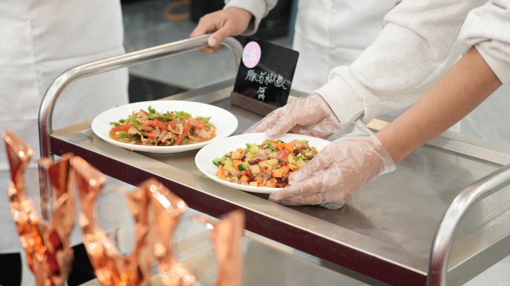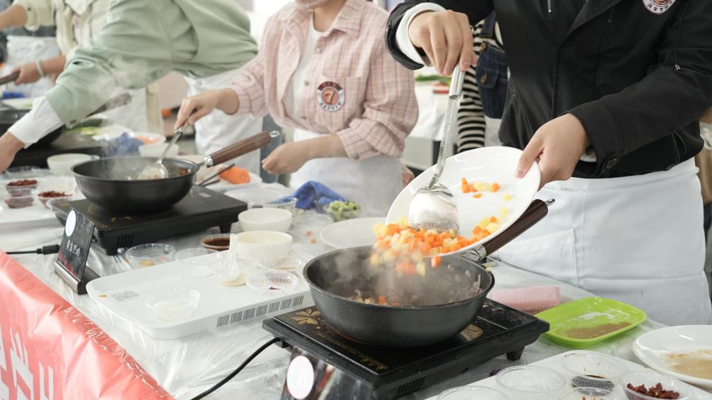参赛者们腰系围裙,头戴厨师帽,专注地在各自的烹饪台前忙碌着,纷纷亮出自己的看家本领,从选材、切配到烹饪、装盘,每一个环节都一丝不苟,展现出高超的厨艺水平和良好的劳动习惯,空气中弥漫着各种食材的香气,锅碗瓢盆的碰撞声此起彼伏。评委们穿梭于台前,仔细观察着每一道菜品的制作过程,啦啦队不时发出赞叹声,拿起手机记录美好瞬间。