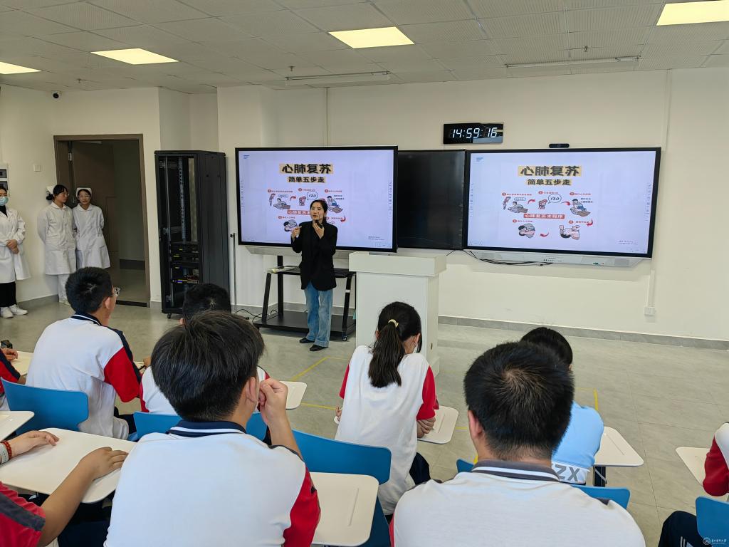 护理学院教师王丽以“科技如何助力护理工作”及“VR虚拟仿真技术在护理教学中的应用”为主题,通过案例展示智慧护理场景;教师吴明碧追溯心肺复苏技术(CPR)发展脉络,让学子们直观感受急救技术的迭代升级。