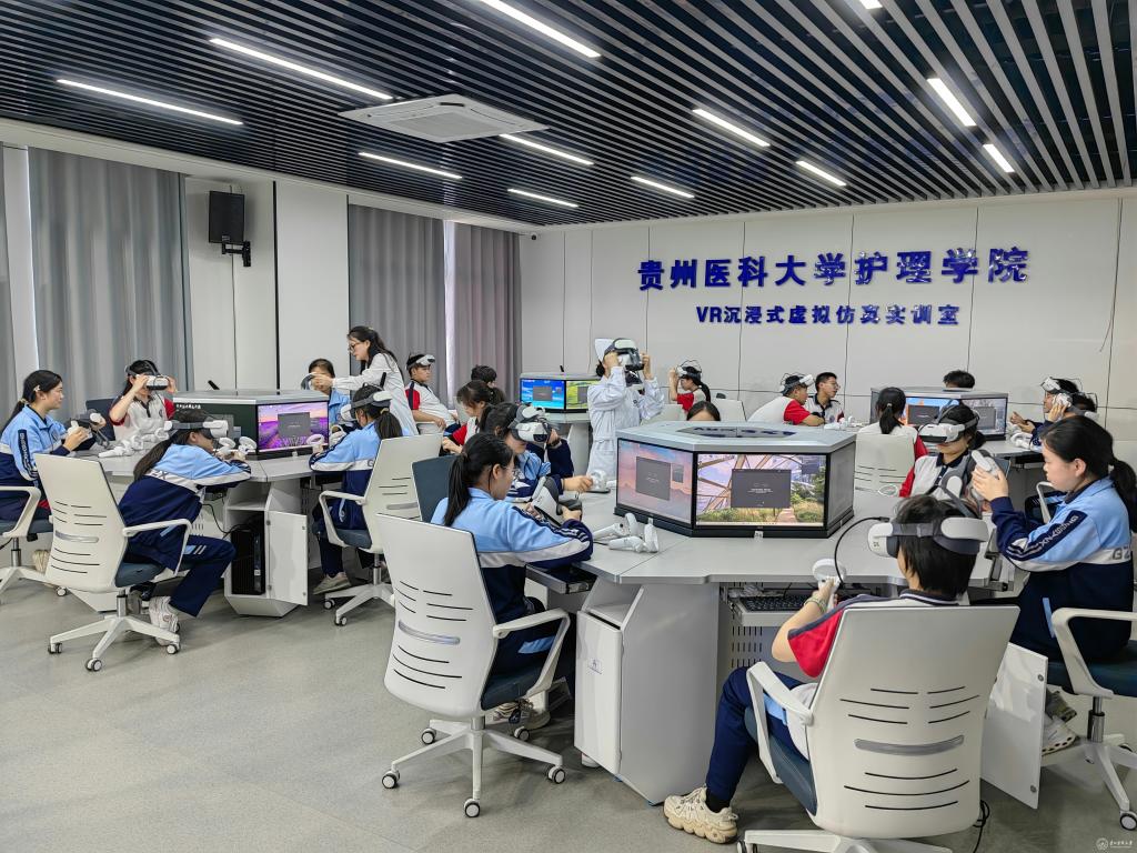 在实验室参观环节,活动参与者分组跟随教师探秘护理学技能实验中心,近距离观察VR虚拟仿真设备如何模拟临床护理场景。进入沉浸式体验环节时,同学们戴上设备化身“虚拟护士”,在高精度模拟环境中完成护理操作,专业教师全程指导破解技术难点。在CPR急救技能实战培训环节,吴明碧教师主讲CPR技术,随后与饶梦老师分组现场指导学生练习,确保每位参与者掌握规范操作流程。