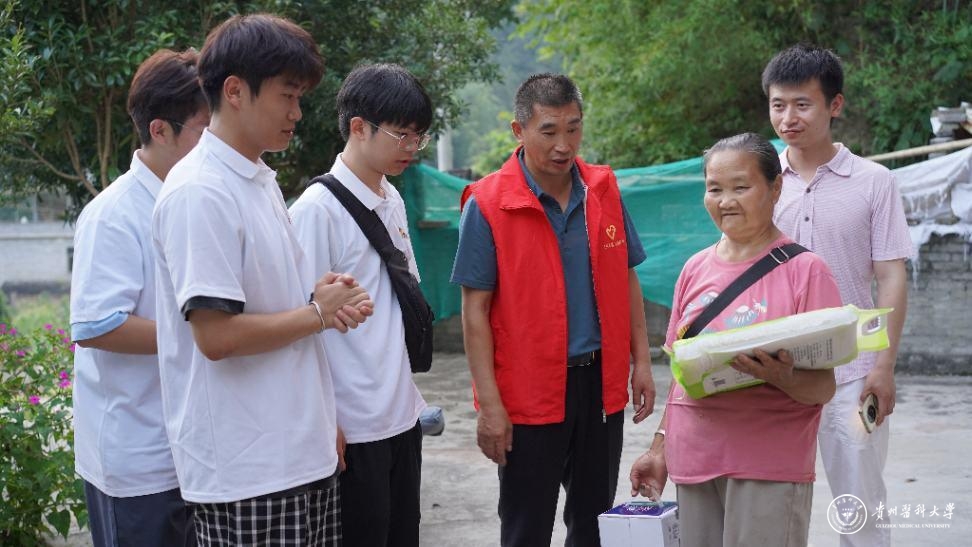 黔山如黛,青瓦生烟。实践队跟随蜜蜂村驻村第一书记陈帅帅穿行于古朴村巷,在探访村中长者时,一幅动人的画面徐徐展开:陈帅帅俯身半跪,指尖轻搭在患胃疾老人的腕间,“夜里起夜还频繁吗?”“那味药得就着热粥喝才舒坦”,问诊声混着蝉鸣,把药理知识酿成了乡音里的絮语。老人们眼角的笑纹盛着信任,队员们在一旁默默学习,心底正悄悄生长着对“医者”二字的新注解。