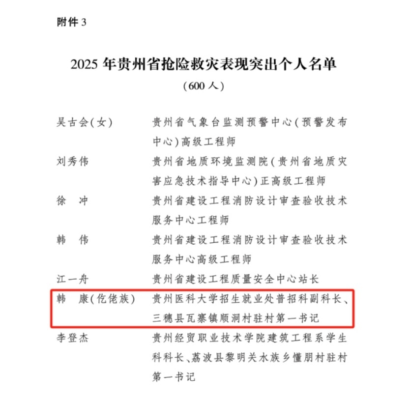 8月5日,中共贵州省委、贵州省人民政府发布了《关于对2025年全省抢险救灾表现突出集体和个人予以表扬的通报》,太阳成驻村工作队三穗县瓦寨镇顺洞村驻村第一书记韩康荣获“2025年贵州省抢险救灾表现突出个人”荣誉称号。