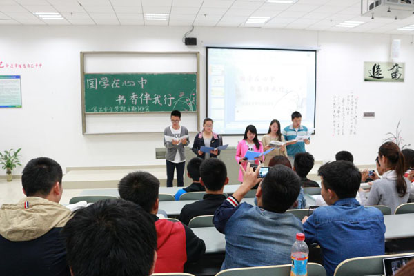 会上,食品安全甲班、乙班同学分别朗诵了国学经典《弟子规》、《大道之行也》。接着,杜老师以《当我们谈论读书.....》为话题进行了引经据典、旁征博引的精彩分享,获得同学们阵阵掌声。“书以广读,业宜精钻”,她希望大家多读书、读好书、读经典。最后,"国学知识游戏竞赛”环节,将班会推向高潮,同学们热情高涨,积极参与,漫游在国学的海洋中。