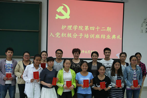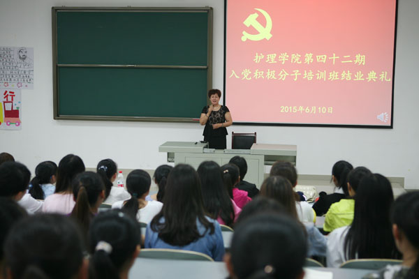 6月10日,护理学院党校第四十二期入党积极分子培训班结业典礼在4106教室举行,护理学院党委书记贾秀英、副书记杨英、学生党支部书记李海林及130名学员参加了典礼。典礼由杨英副书记主持。