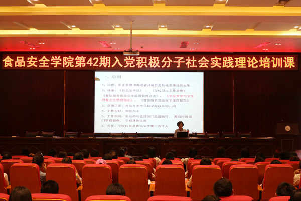 6月9日下午,食品安全学院在道德讲堂举办了第42期入党积极分子社会实践理论培训讲座。讲座主题为学校食堂安全监督管理,食品安全学院副院长孙晓红主讲,副书记兰玲介绍了本次活动的总体安排和要求。食品安全学院全体教师、入党积极分子和学校食堂从业人员共200余人参加。