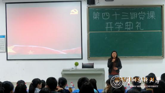 唐正龙首先宣布第四十三期党课开课,全体起立合唱国歌,周红向学员们介绍了本期党校开展的目的和党课内容,并希望学员们努力做到以下三点:一、全体学员要增强对党的认识,加强对党的理论知识学习。二、端正入党动机,培养社会责任感,并做一个有理想、有道德、有文化、有纪律的四有青年。三、遵守组织纪律,保证出勤率,要做到不迟到、不旷课、不早退。李雪梅介绍了本期党课培训安排。2014级口腔医学学生代表母澔葳做了发言,她承诺:“我们将以最饱满的热情,最全面的投入,最实际的行动来完成我们最渴望的党课学习”。