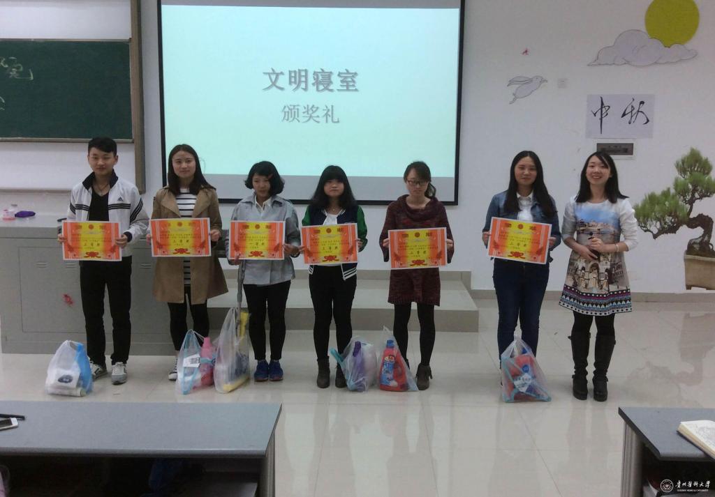 本次活动共评选出7434、7435、7439、7626、9629、7639六个文明寝室,辅导员为获奖寝室颁发奖状及礼品。