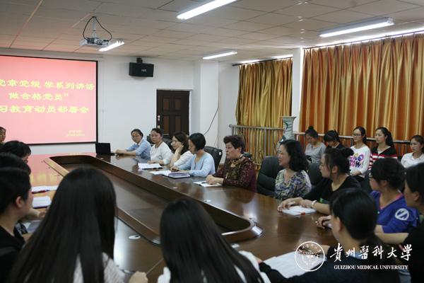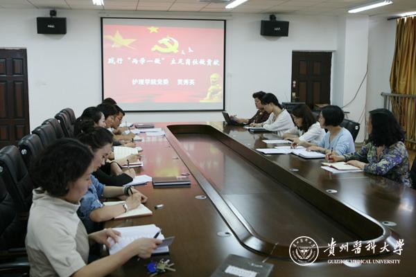 会上,贾秀英书记传达了学校关于开展“两学一做”学习教育有关会议精神,对护理学院“两学一做”学习教育进行了动员部署,要求全体党员充分领会“两学一做”学习教育的重大意义,认真学习党章党规和习近平总书记系列重要讲话,要以高度的政治责任感,事事处处起模范带头作用,以主人翁精神把“两学一做”学习教育与“两评估两认证”工作结合起来,为建设“具有明显特色、西部一流、在国内外有影响力的医科大学”做出应有的贡献。