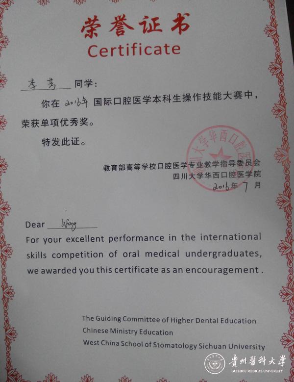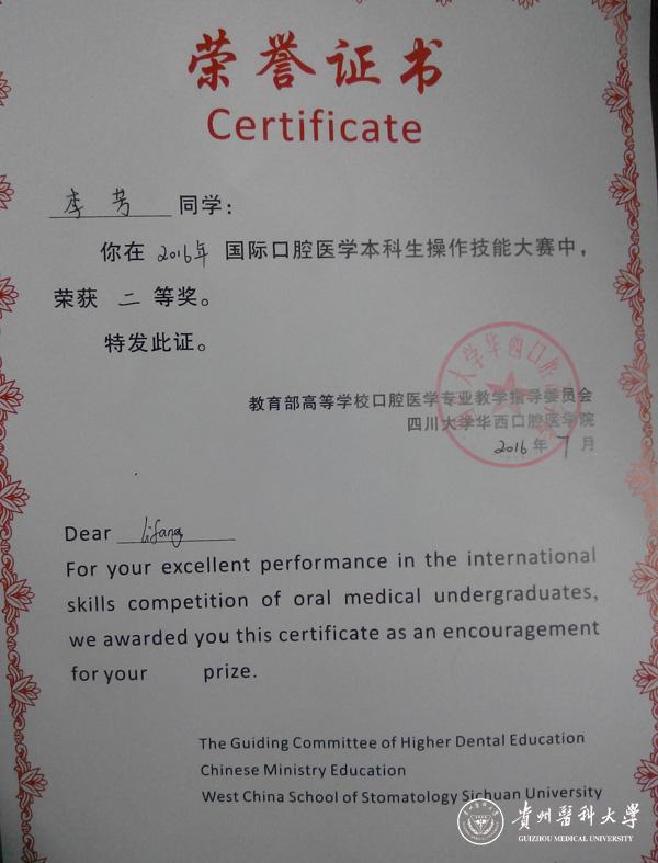 7月14日上午,李芳作为太阳成集团tyc33455cc官网代表参加华西夏令营中的国际口腔医学本科生操作技能大赛中的7个项目,最终在国内外高校中荣获二等奖,另外也在巴唐绷带包扎项目中荣获单项奖。