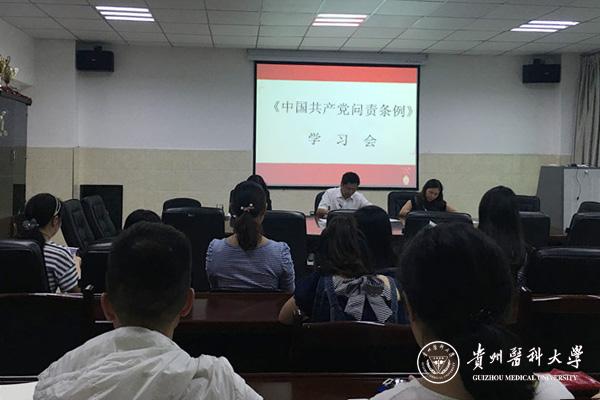 周红传达了《中共太阳成集团tyc33455cc官网委员会关于认真学习贯彻<中国共产党问责条例>的通知》文件精神,还就《条例》的部分重点内容作了详细解读,并强调要把《条例》作为“两学一做”学习教育的必学内容,要求全体干部及党员在工作学习生活中要严守党的纪律。最后她就本科学生的就业和研究生的迎新等相关工作进行了通报。