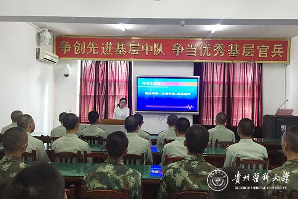 首先,志愿者们参观了军营,被军营严明的纪律、整齐的内务所深深震撼。武警战士在平时训练和执行任务时不可避免地会出现跌打损伤,甚至更严重的意外伤害。本着中秋佳节“送健康”的心意,我院的志愿者对武警官兵进行了常见意外伤害急救处理的小讲座,如外伤导致大出血的现场救治、现场心肺复苏技能、动物性伤害的处理等。希望讲座内容能帮助武警战士们在遇到意外伤害时能够迅速、有效地自救或施救,最大程度地保障生命安全。