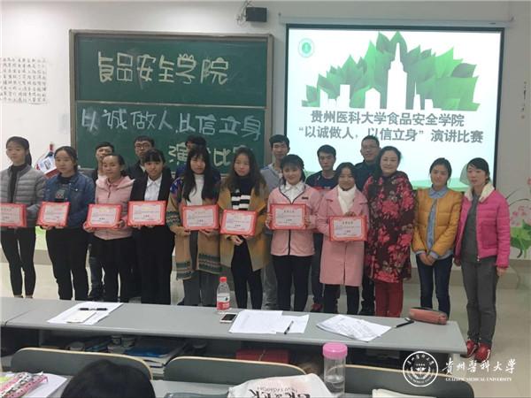 为加强学生的诚信意识,发扬诚信精神, 11月10日,食品安全学院在明理楼7203教室举行了“以诚做人,以信立身”为主题的演讲比赛。学院党委书记兰玲,辅导员陈卫娅、党支部宣传委员原琦,以及各年级班主任老师莅临现场担任此次比赛的评委。