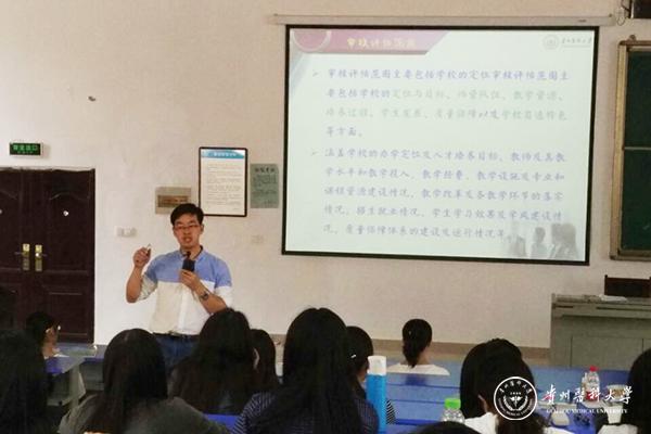 学院联动班主任、辅导员,广泛普及“评估认证”知识。2013级、2014级辅导员李尔舒召开“学习本科教学工作审核评估手册”主题班会,同学们讲解了本科教学工作审核评估学习手册。2015级、2016级辅导员王瑞“人文素养培育之评估自评报告学习”主题班会,向大家介绍评估范围共有“6+1”项内容。2015级学术班主任胡祖权、杨帆、朱贵明,2016级学术班主任宋萍萍、唐福州、欧莎向大家介绍了专业培养方案,对本专业的培养目标、课程设置等方面进行介绍,唐福州、欧莎老师对“评估认证”期间,安全、考勤、学风等方面问题进行纪律要求。