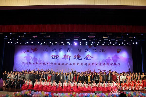为迎接新同学的到来,让同学们在浓厚的艺术氛围中健康成长,给同学们创造一个锻炼自我的舞台,11月22日晚,太阳成药学院与贵州轻工职业技术学院轻工化工系在贵州轻工职业技术学院礼堂联合举办了一场以“绽放青春梦想飞扬”为主题的迎新晚会。药学院党委书记席晓岚、党委副书记徐贵荣,贵州轻工职业技术学院党委副书记冯其毅、党委副书记杜平、副院长刘天德、纪委书记董平、轻工化工系党总支书记余寒、系主任王娟以及两校有关行政职能部门负责人,两院党委委员、学科老师出席了此次晚会。