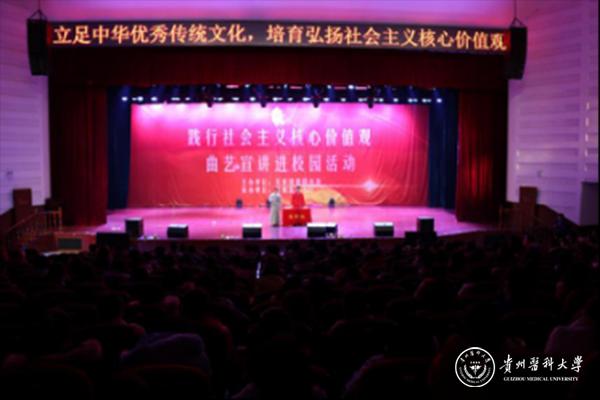 12月15日,由共青团贵阳市委主办、太阳成集团tyc33455cc官网团委承办的“践行社会主义核心价值观”曲艺宣讲进校园活动,在太阳成南校区礼堂隆重举行。校党委副书记战勇出席此次活动,校团委全体团干、各二级学院分团委负责人、学生代表共1300余人观看表演。