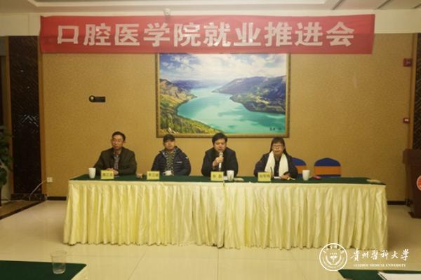 为更好地推进我院2017届毕业生就业工作,12月21日下午,口腔医学院2017届毕业生就业工作推进会在品怡酒楼二楼会议室召开。院党委书记张军梅,党委副书记唐正龙,贵阳市口腔医院专家门诊部主任张磊,贵州省口腔医学院副会长李卫斌以及相关职能科室老师参加会议。会议由学生科钱禾主持。