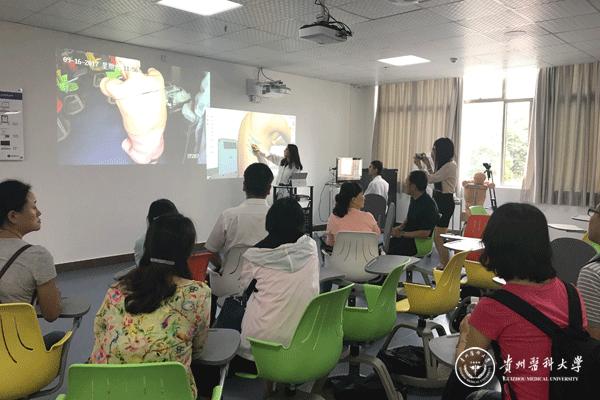 期间,临床技能中心工作人员对“智慧型”临床技能中心的建设及运作情况作了介绍,并展示了自主在线训练平台、虚实结合智能一体化教室、VR,AR解剖教学、无菌操作教学等。