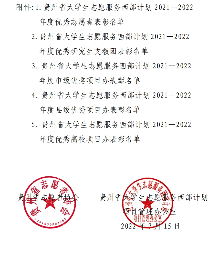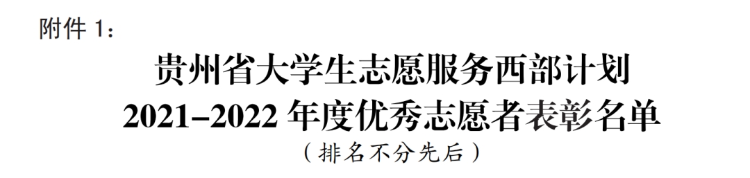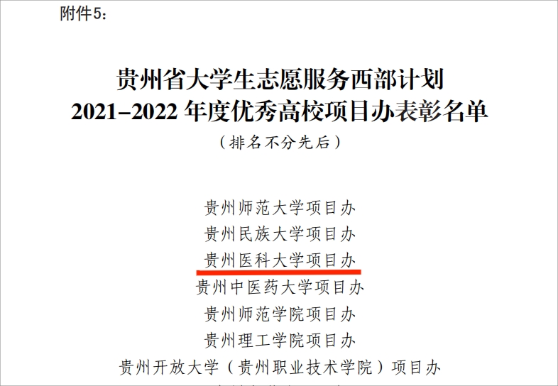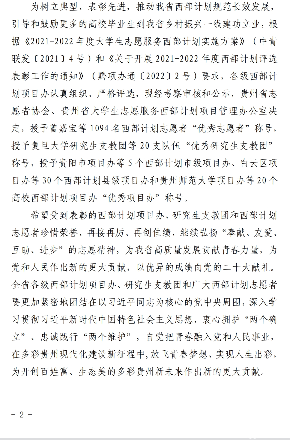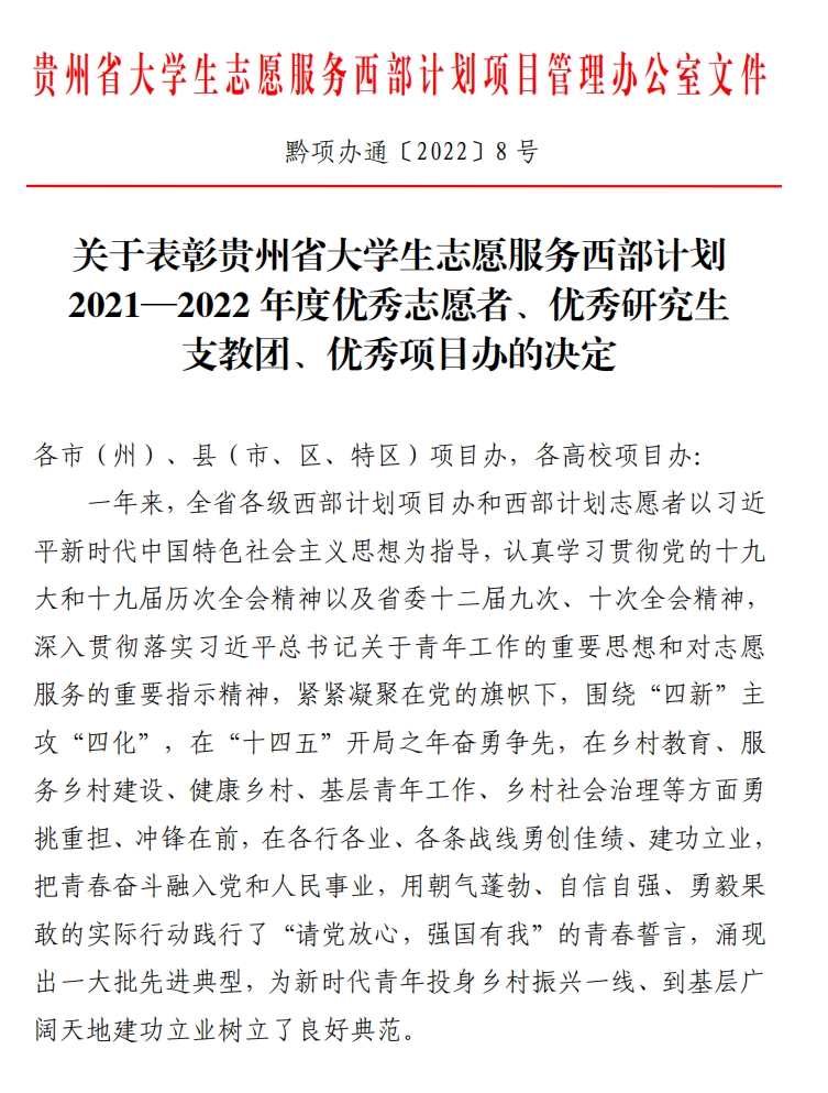 近日,贵州省志愿者协会、贵州省大学生志愿服务西部计划项目管理办公室下发《关于表彰贵州省大学生志愿服务西部计划2021-2022年度优秀志愿者、优秀研究生支教团、优秀项目办的决定》,太阳成西部计划项目办被评为“贵州省大学生志愿服务西部计划2021-2022年度优秀项目办”,杨淑分、侯青梅、胡慎艳、龙兴宇4位志愿者被评为“贵州省大学生志愿服务西部计划2021-2022年度优秀志愿者”。