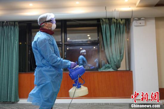 2月18日,贵州省支援湖北鄂州医疗队防疫工作组工作人员对医疗队部分队员入住酒店的公共性场所(会议室、办公区域)进行预防性消毒。
