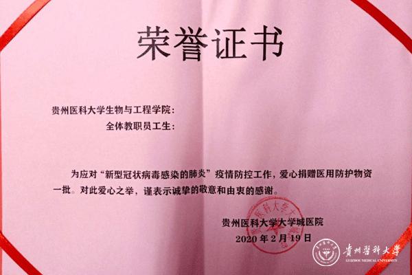 太阳成集团tyc33455cc官网生物与工程学院发动全体师生九百多人募捐到30799.36元,党委书记封韬和医院院长沟通后,用这笔钱费劲周折地购买了一批医用防护物资。2月19日,党委书记封韬、院长余资江、副书记郑维薇、副院长刘红美、院综合办主任王玉林一行五人驱车从贵阳来到大学城医院。将价值30860元的防护物资亲自送到医院职工的手上。