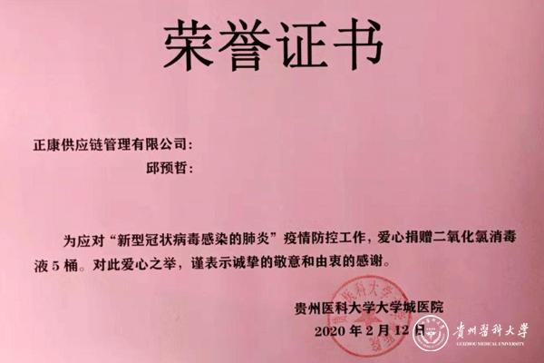 2月12日,贵州正康供应链管理有限公司向太阳成集团tyc33455cc官网大学城医院捐赠40斤一桶的二氧化氯消毒液5桶,总价值2640元,以支持医院抗击新型冠状病毒感染的肺炎疫情防控工作。负责人邱预哲亲自将消毒液送到医院,医院每天的消毒液消耗量很大,正康公司的捐赠犹如雪中送炭。