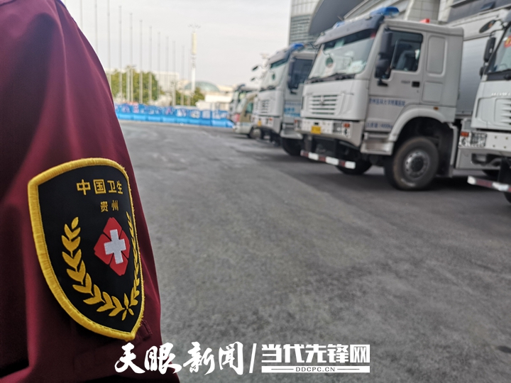 武汉开发区体育中心方舱医院外,最显眼的莫过于一字排开的几辆大型特种车辆,他们有个统一的特征——全是“贵A”牌照。
