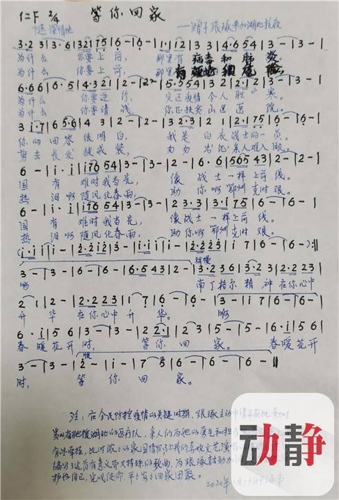 这是一张歌单上的歌词,歌名叫《等你回家》。歌是贵州援助鄂州医疗队队员、贵医附院心外科护士长张琢的父亲一笔一笔用手写在纸上的,略有修改,饱含深意。在歌单的最下方,父亲还写下了这样一段话——