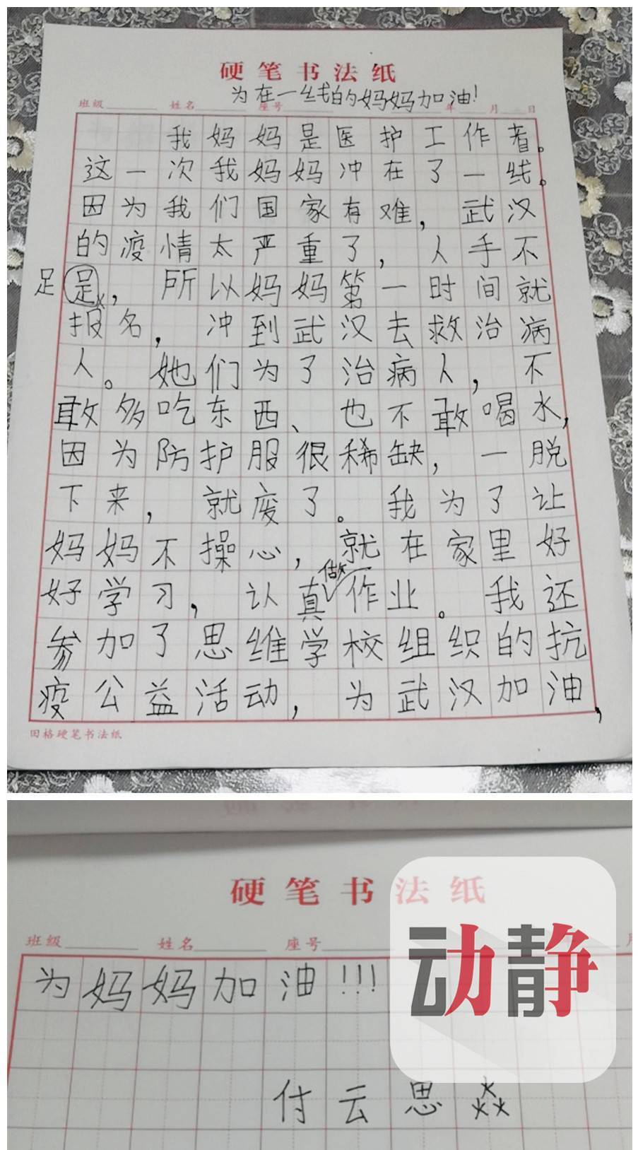 前些天,家人给张云发来了儿子写的一篇小作文 ,虽然绝对不是什么浑然天成的“大作”,甚至还有错别字,但是那一刻张云觉得,她的付出太值得:“不仅完成了自己作为医护人员的使命和担当,能够让儿子感到骄傲也是她作为一个母亲最欣慰的回报。”