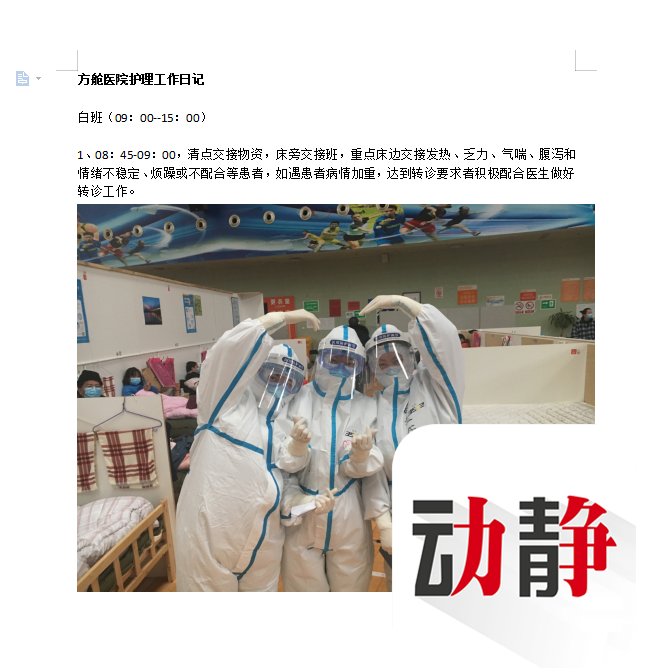 今天穿上防护服,一直要到晚上九点多才能出舱,所以昨晚一直在担心手记会“失约”。还好,睡前收到我的“方舱秘书”发来的工作日志,我才想起好像应该聊聊他。