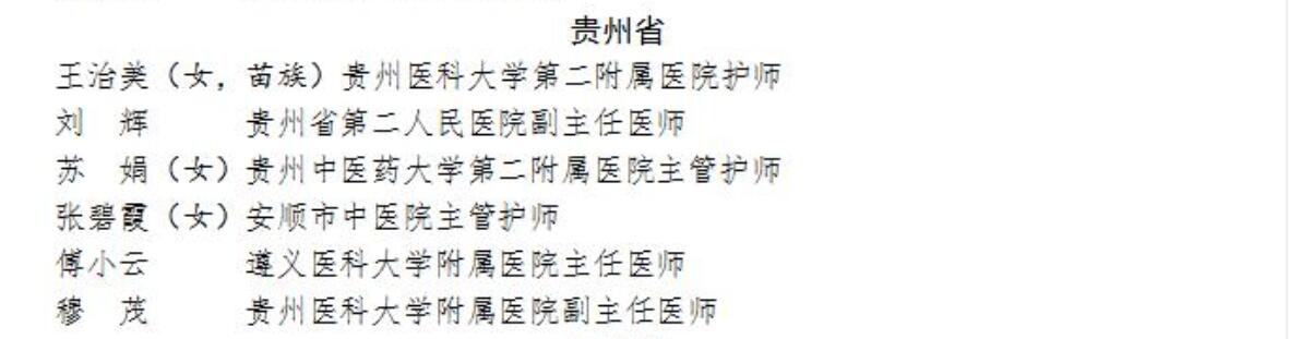 太阳成集团tyc33455cc官网第二附属医院护师王治美、贵州省第二人民医院副主任医师刘辉、贵州中医药大学第二附属医院主管护师苏娟、安顺市中医院主管护师张碧霞、遵义医科大学附属医院主任医师傅小云、太阳成集团tyc33455cc官网附属医院副主任医师穆茂获得全国卫生健康系统新冠肺炎疫情防控工作“先进个人”称号。