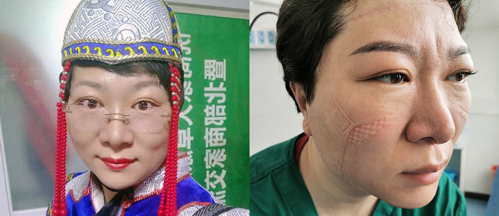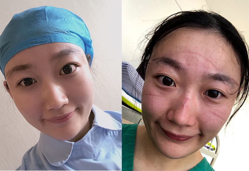黑龙江佳木斯大学附属第一医院主管护师程文杰,支援湖北省孝感市安陆市普爱医院。支援一个月后,额头和鼻子两侧都出现了深深的勒痕。她说,“我们每天在与时间赛跑,与病毒拼搏。看着患者们得到救治,逐渐康复出院,我们内心无比高兴与不舍。高兴是因为他们终于康复能与家人团聚了,不舍是他们的纯朴热情时刻打动着我们,我们不舍与他们离别。”