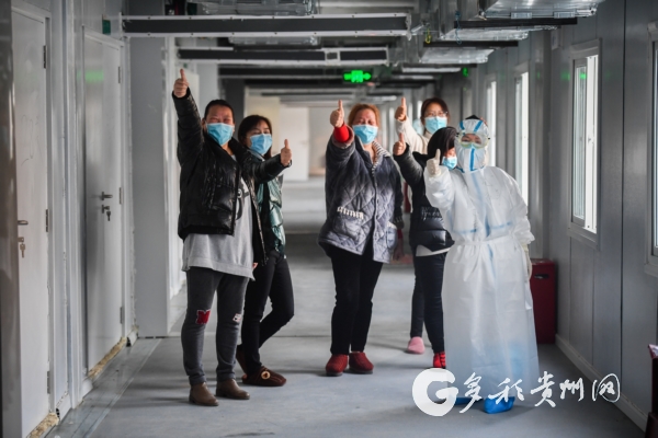 在隔离病区内,贵州医护人员马小霞与患者们一起点赞贵州。