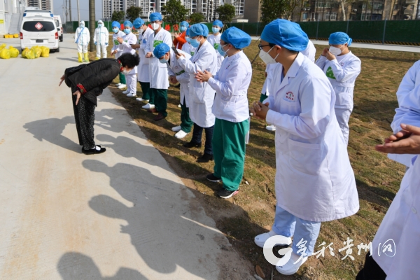 3月14日,治愈者在鄂州雷山出院时,给贵州医护人员鞠躬感谢,医护人员立即回礼。众望新闻记者 杨昌鼎 摄
