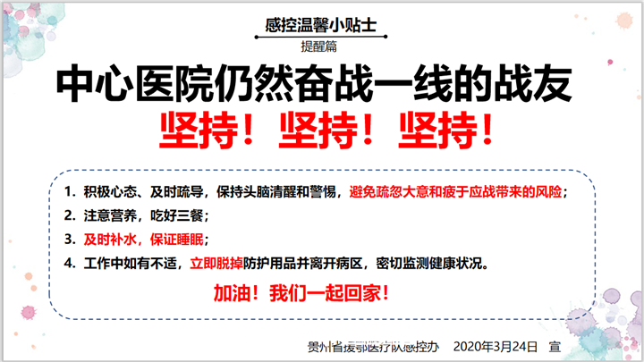 院感防控是非常重要的工作,防控小组丝毫没有放松。雷山医院“清零”后,留守的院感组组长游灿青仍然保持对中心医院的院感监控,把工作做细、做实、坚持到底;队员曾妮如往常一样,一大早就为大家制作了“院感小贴士”,温馨提示院感防控。