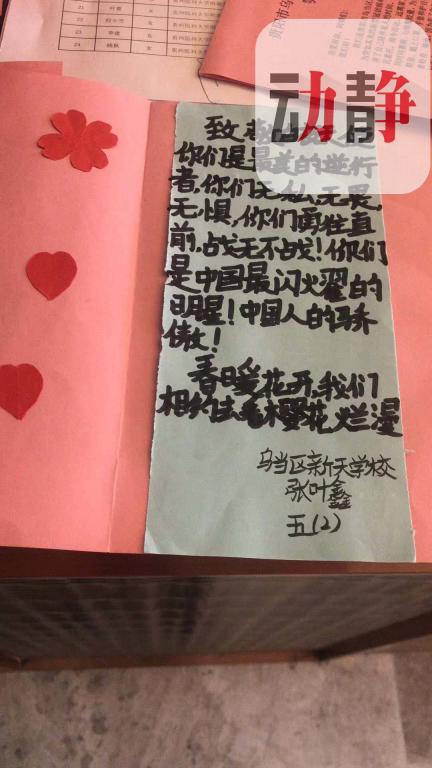 3月17日晚,国家紧急医学救援队(贵州)从武汉回到家乡贵阳。虽然队员们按照规定,在隔离期间不能离开各自的房间,但心却一次又一次地飞出窗外,感受着来自“大朋友和小朋友”们送来的温暖。