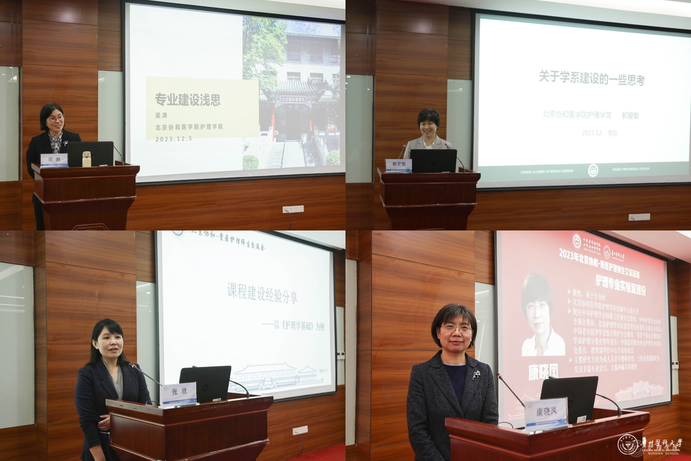 开讲仪式后,各位专家为护理学院师生带来了一系列精彩的讲座。吴欣娟教授作“助力全民健康 彰显护理价值”主旨讲座;李峥教授以“协和护理与贵医-卓越护理人才培养”为题作讲座;北京协和医学院护理学院副院长梁涛教授以“护理专业建设”为题作讲座;北京协和医学院护理学院社区护理学系郭爱敏教授作学系建设分享;北京协和医学院护理学院基础护理学系副主任张欣副教授结合国家级一流课程“基础护理学”的建设作经验分享;北京协和医学院护理实验中心副主任康晓凤教授介绍北京协和医学院护理学院护理技能中心建设经验。