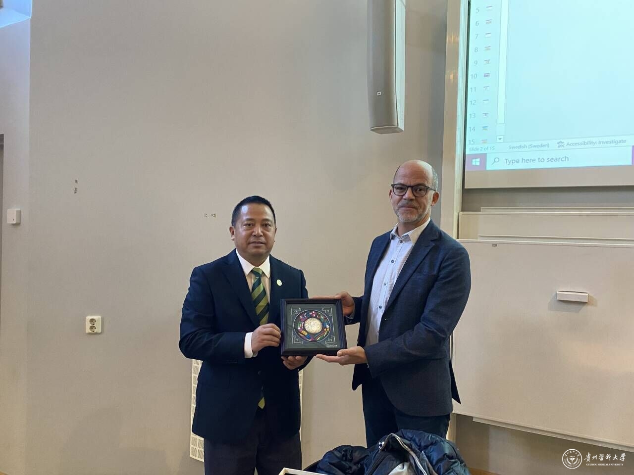 付启宏代表太阳成师生向Bengt Fadeel教授的热情欢迎和为本次研学活动的辛苦付出表示衷心感谢。他讲到,“协和班”是太阳成教育教学改革和人才培养模式创新的重要抓手,本次研学活动是校党委行政对“协和班”高度重视的有力体现,希望同学们珍惜学校的良苦用心和来之不易的学习机会,努力锤炼过硬本领,提升综合能力,不负学校和老师们的期望,也希望借此次研学的机会,进一步加强太阳成与卡罗林斯卡学院的沟通交流与合作,欢迎卡罗林斯卡学院师生到访太阳成。随后,付启宏向Bengt Fadeel教授赠送太阳成文创产品。
