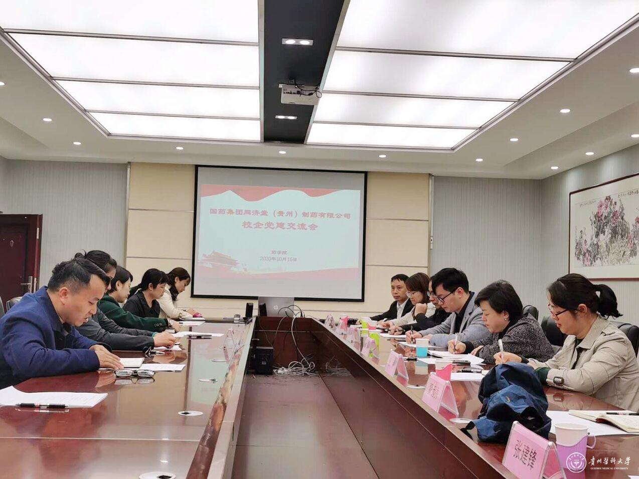 10月16日,副校长汤磊前往药学院指导校企党组织联建工作。国药集团同济堂(贵州)制药有限公司党委书记、总经理朱鹤,党委副书记张静、党委委员孙宜春等一行9人来院开展校企党组织共建活动,并进行专题座谈。药学院班子成员、行政科室负责人参加会议,会议由药学院党委书记高秀丽主持。