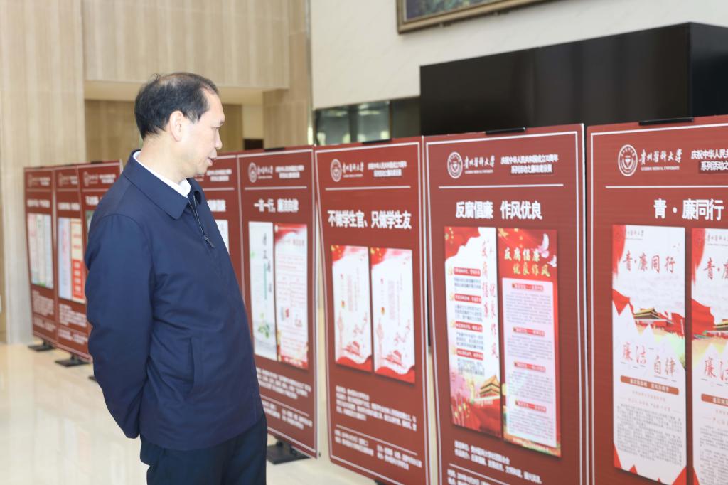 10月29日至11月6日,由校纪委、校团委主办的“廉洁教育永远在路上”——庆祝中华人民共和国成立70周年系列活动之廉洁建设展在太阳成南校区知雨楼一楼大厅展出。校党委书记林昌虎、纪委书记王之瑞、党委副书记战勇观看图片展。