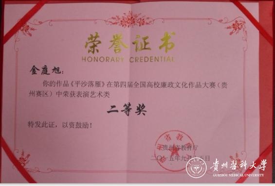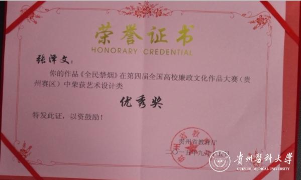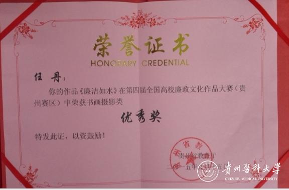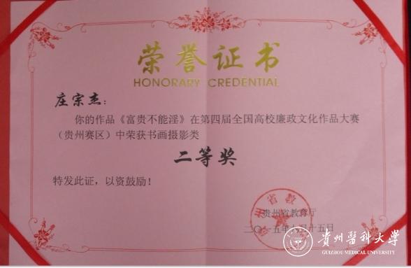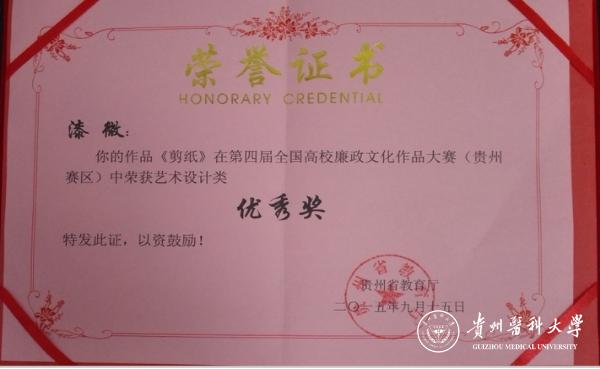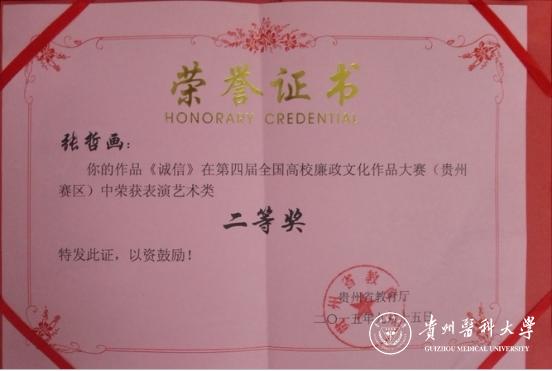 近日,省教育厅本着“公平、公正、公开、择优”的原则,邀请有关专家对各高校选送廉政文化作品开展贵州赛区比赛评选工作。太阳成退休教师庄宗杰的书法作品《富贵不能淫》获书画摄影类二等奖;影像学院学生任丹的书法作品《廉洁如水》获书画摄影类优秀奖;公共卫生学院教师金庭旭的古琴独奏《平沙落雁》获表演艺术类二等奖;团委选送学生张哲画等表演小品《诚信》获表演艺术类二等奖;医学检验学院学生张译文的作品《全民禁烟》、漆微的作品《剪纸》均获艺术设计类优秀奖。特此祝贺!