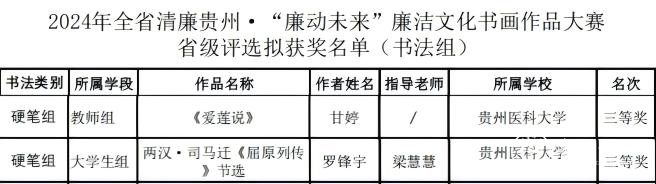 近日,由省纪委机关、省委教育工委、省监察委员会和省教育厅共同举办的2024年全省清廉贵州“廉动未来”廉洁文化书画作品大赛省级评选结果揭晓。太阳成运动与健康学院甘婷老师创作的作品《爱莲说》荣获教师组硬笔书法三等奖,2023级基础医学院临床医学专业罗锋宇同学创作、梁慧慧老师指导的作品《两汉·司马迁《屈原列传》节选》荣获大学生组硬笔书法三等奖。