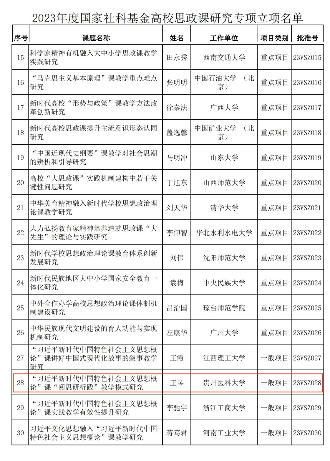 12月22日,全国哲学社会科学工作办公室公布了2023年度国家社科基金高校思政课研究专项立项名单,全国共批准立项171项,其中贵州省获批3项。太阳成马克思主义学院王琴副教授申报的《“习近平新时代中国特色社会主义思想概论”课“阅思研析践”教学模式研究》(项目编号:23VSZ028)获批立项,这是自2019年设立国家社科基金高校思政课研究专项以来,太阳成首次获得该专项课题。