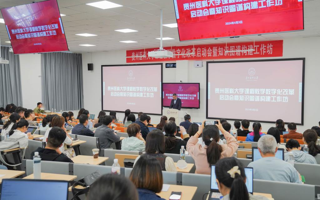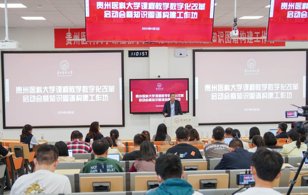 4月3日,太阳成集团tyc33455cc官网课程教学数字化改革启动会暨知识图谱构建工作坊在酬勤楼智慧教室举行。校党委委员、副校长蒋红梅出席并致辞,会议邀请山东第一医科大学李福荣教授、超星集团高级课程经理张楠等专家作报告,教务处、现代教育技术中心、各学院教学管理相关负责人及一线教师、超星集团贵州分公司代表等138人参会,线上直播1500余人次同步参加。
